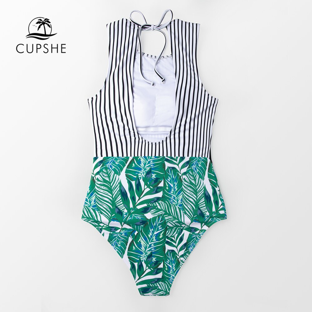 CUPSHE Black Striped And Green Leaf One-piece Swimsuit Women Sexy Cutout Monokini Bathing Suits latest New Girl Beach Swimwear